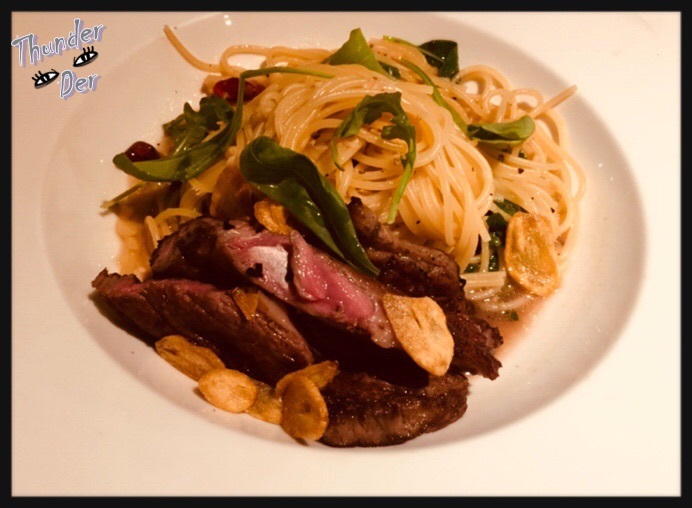 店家使用烤過的蒜片和曬過的乾辣椒下去拌炒義大利麵,喜歡那香辣口感的食友們可別錯過了!上桌時,那蒜香四溢配著牛排(對!還是牛排。 滋味真是絕妙呀!