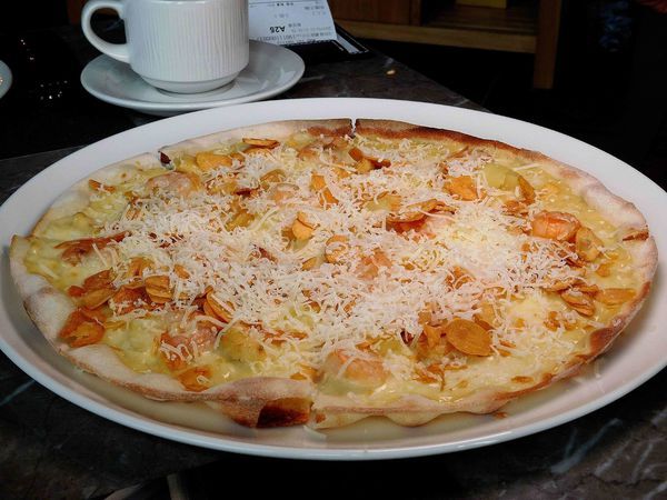披薩以蜂蜜美乃滋為基底醬 ,蝦仁雖然不會很大 ,但挺彈牙的 ,鳳梨更是甜蜜的沒話說