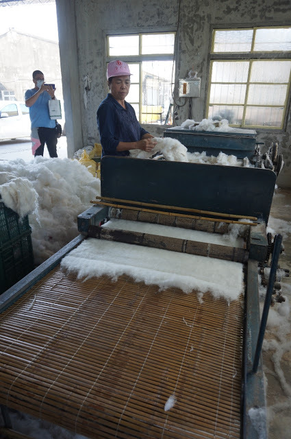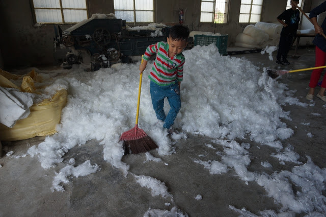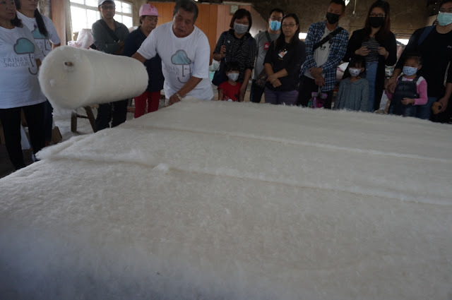 接著當然要幫忙把玩亂棉花山掃成堆,因為老闆還要捲棉被呢~身體黏好多棉花喔!老闆的材料損失很多,哈