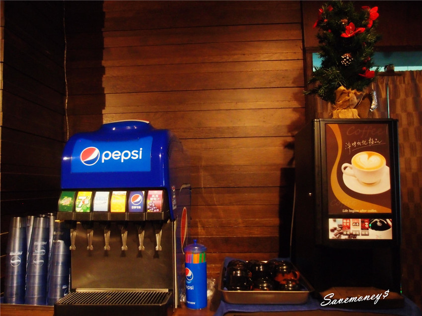 自助式飲料區,除了左邊的氣泡式飲料,右邊還有咖啡機可以自取