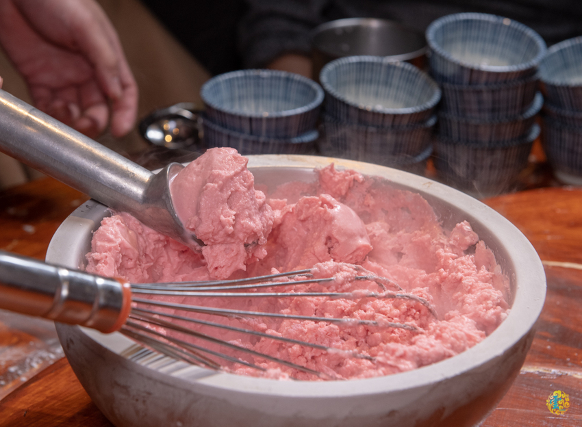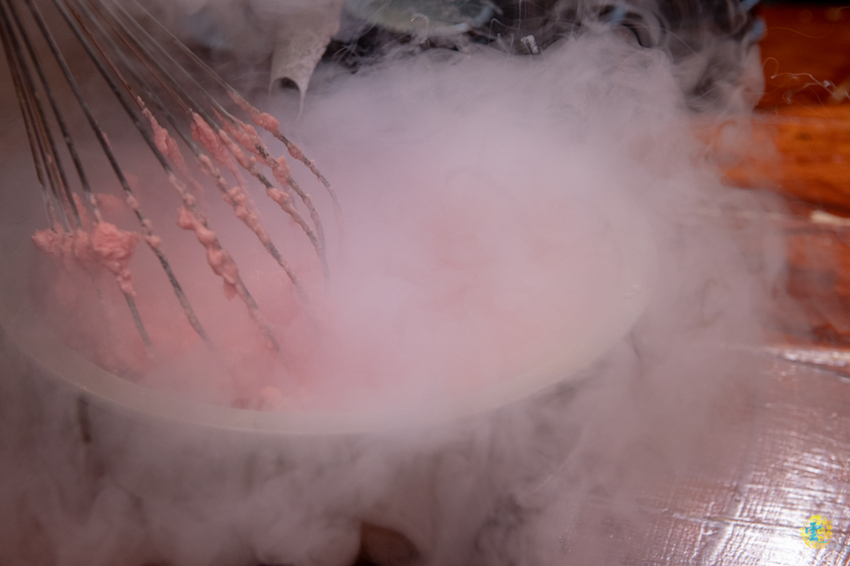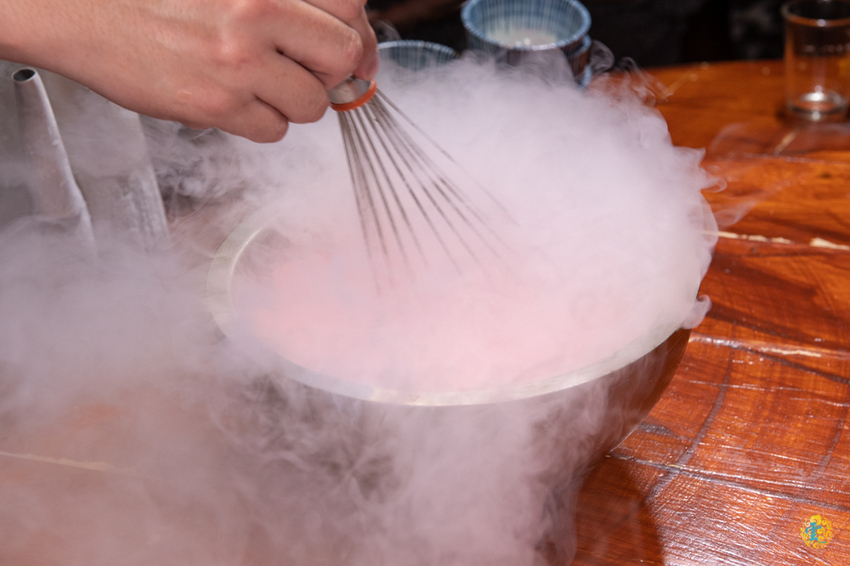 飯後甜點是仙人掌冰淇淋,將來自澎湖的仙人掌的籽,煮融打碎之後過濾,然後取他的汁液,在利用液態氮(零下196度)混合,裡面的原料有牛奶、蛋黃跟糖。透過不停的攪拌與適時的加入液態氮,反覆操作直到凝固為止。吃起來感覺很像西瓜牛奶的滋味,但他的甜更加優雅些,充滿視覺與味覺驚奇的甜點。