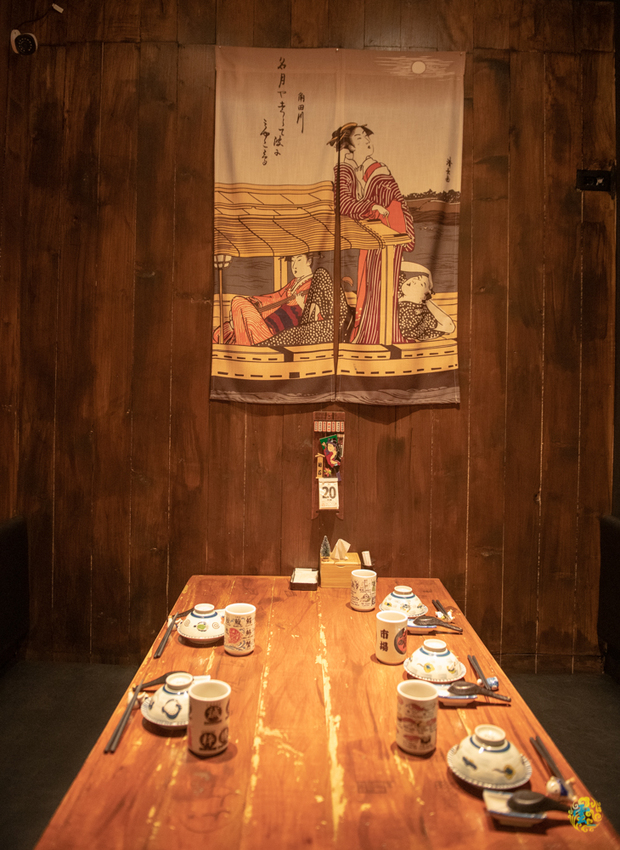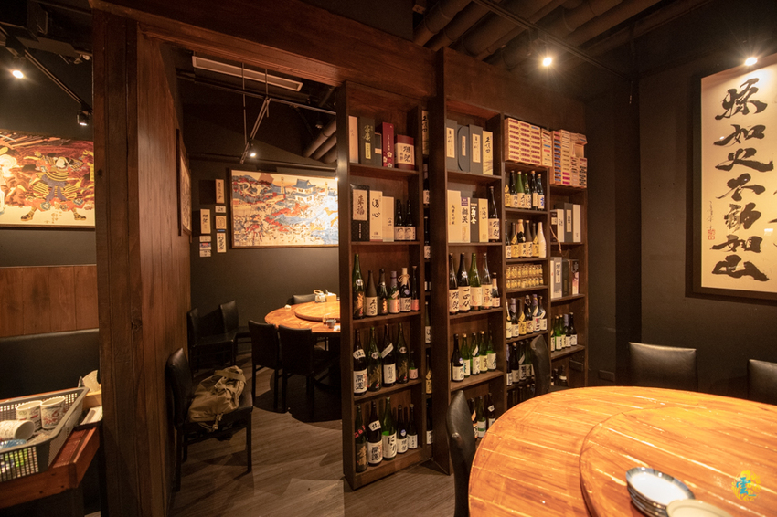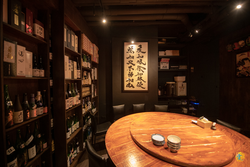 店內的位置有兩大圓桌與四個方桌,其中一個圓桌位在包廂內,這包廂的門還是個酒櫃,關起門後還有隱藏效果。酒櫃裡滿滿的日本酒,當然冰箱裡也是。