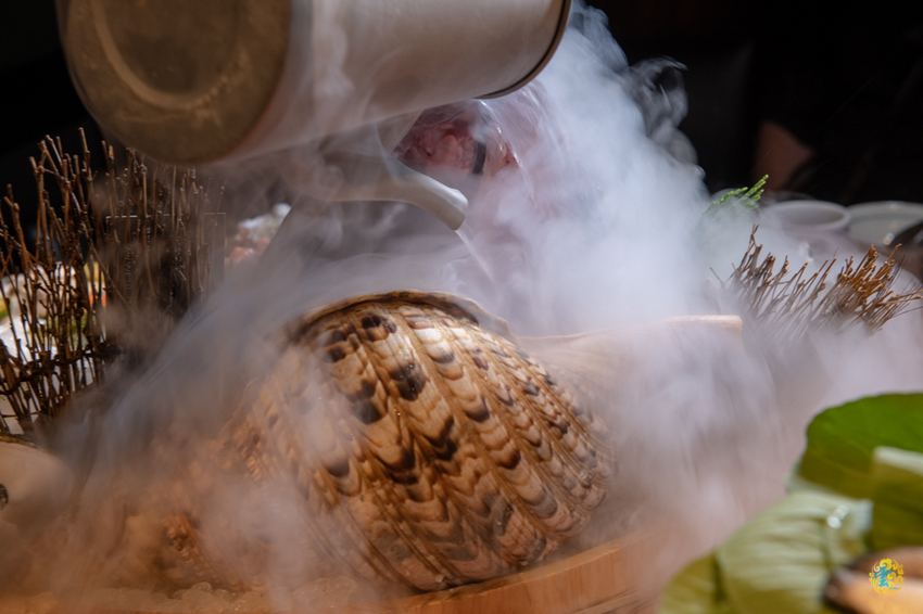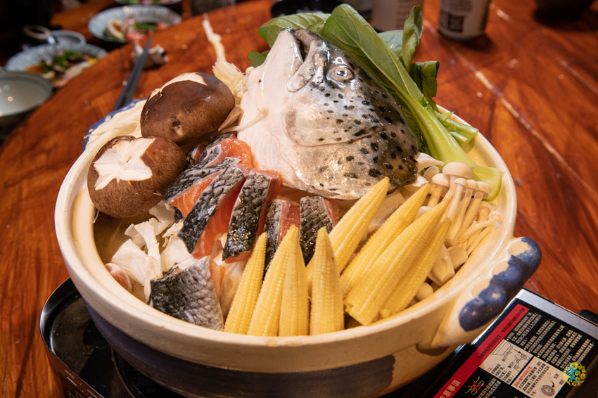 湯底是味噌湯,加入許多豐富的配料有香菇、金針菇、玉蜀黍、高麗菜、青江菜與鮭魚肉。鮭魚肉飽滿細膩 ,在蒸氣與水花的簇擁下,搭配眾多鮮蔬更能凸顯鮭魚肉吮指甘甜的本質。