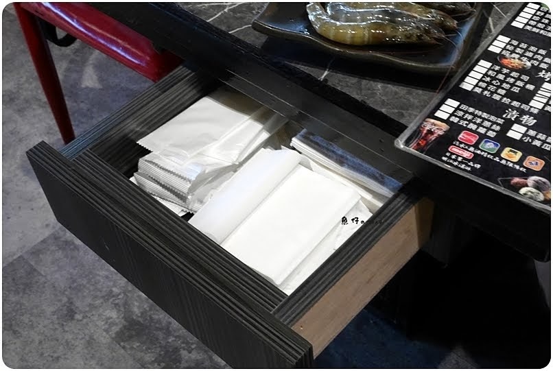 每組桌子側邊都有一個小抽屜,裡面有濕紙巾和衛生紙,不夠可以再跟服務人員索取,不過這補滿的狀況下通常是不需要(節能減碳、環保愛地球好嗎?)