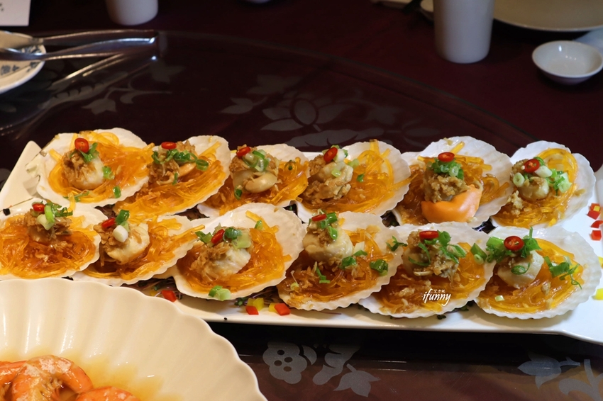新鮮的大扇貝佐以蒜茸醬,其下襯著粉條。