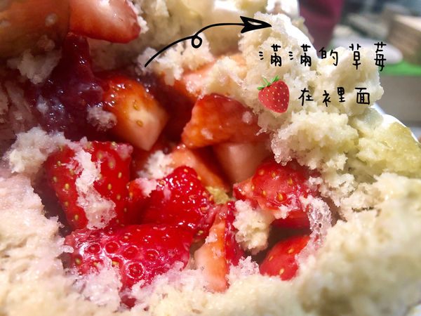 吃到中間,有滿滿的酸甜草莓,很讓人驚喜,草莓的份量給的不手軟,還有店家自製的滑順奶酪,