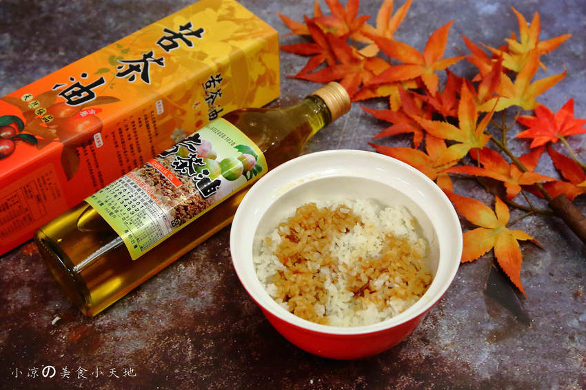 首先淋上一點苦茶油在飯上,讓每粒米上都沾上了茶油&醬油