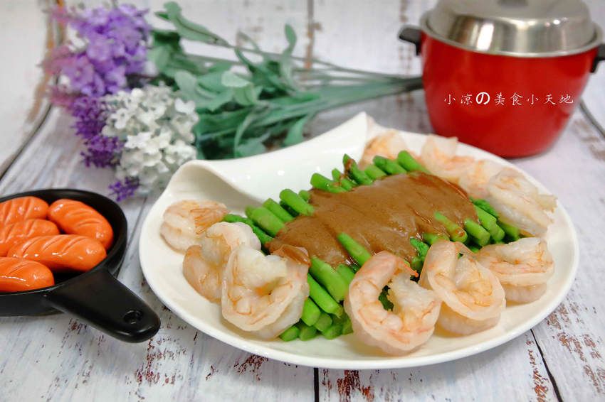 每次去餐廳常見到經典開胃菜鮮蝦蘆筍沙拉,小凉突發奇想的把蜂蜜芥末醬改成芝麻醬