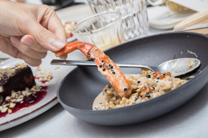 魚卵松葉蟹燉飯非常厲害,將妳我所熟悉的日式風味融入燉飯中,燉飯吸飽蟹味噌、醋薑、昆布高湯精華,再綴上炭烤後的肥美松葉蟹腳,上桌時服務生再以桌邊服務的方式淋上白酒奶油魚子醬