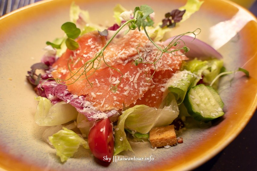 煙燻鮭魚凱薩沙拉,大片的煙燻鮭魚鋪滿沙拉,