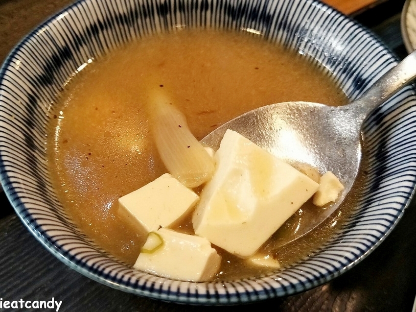 味噌湯一點不馬虎,豆腐很多之外,還有些許豬肉片(條?),口味是比較重一點,這喝完還能免費續。