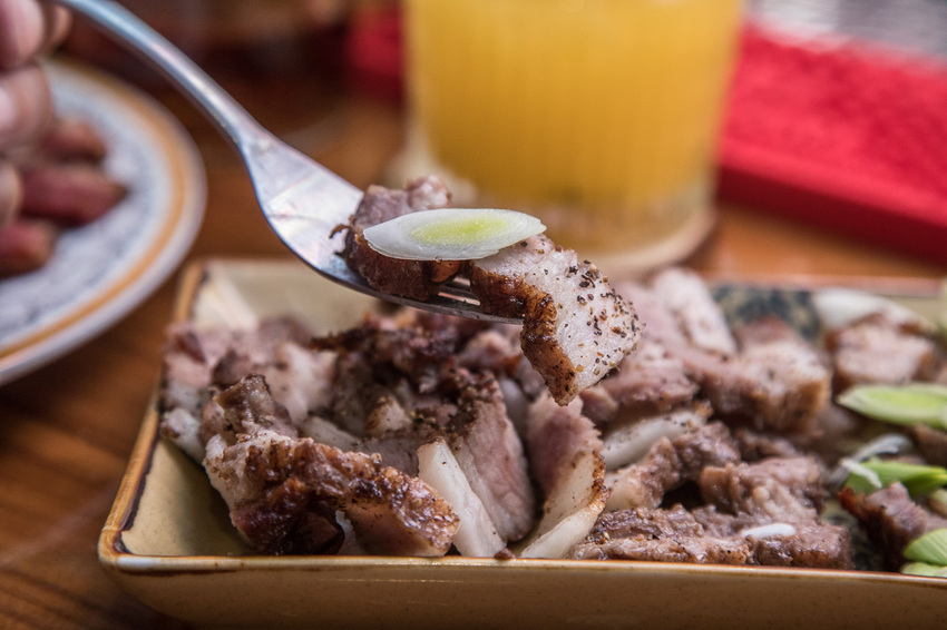 有中式風情的調酒,Mix Bistro也推出了中式料理下酒菜,烤鹹豬肉便是經典囉!烤的噴香的鹹豬肉搭上蒜苗撒上微辣刺激的黑糊椒,相當下酒,第一次在酒吧裡喝調酒配鹹豬肉,挺有趣的體驗呢