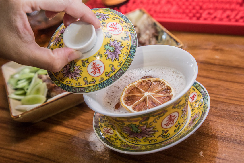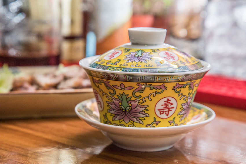 調好的茶酒用中式的彩繪蓋碗當容器,看起來貴氣又有質感!