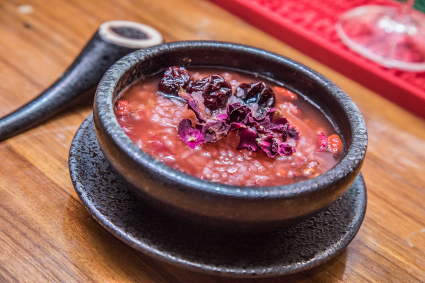 本酒綱目:解鬱助眠篇是用吃的調酒,就像吃粥一樣,吸滿白蘭地的米粒入口還帶有一點QQ的口感,咀嚼時滲出濃厚的白蘭地酒香,但因為加入了紅棗跟枸杞,還有米本身澱粉煮過釋放出的甜味,讓白蘭地的酒氣變的溫潤芳香,喝完不僅身體暖呼呼,腦袋也輕飄飄,助不助眠我是不知道,此刻倒是很解鬱