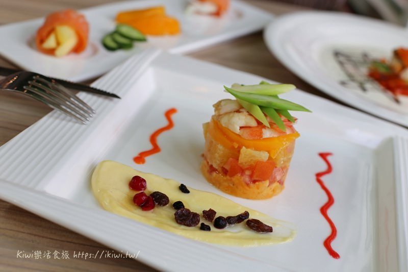精緻到說不出話來了,以在地食材入餐,地瓜泥與番茄丁的結合,水果塔層層的交錯堆疊