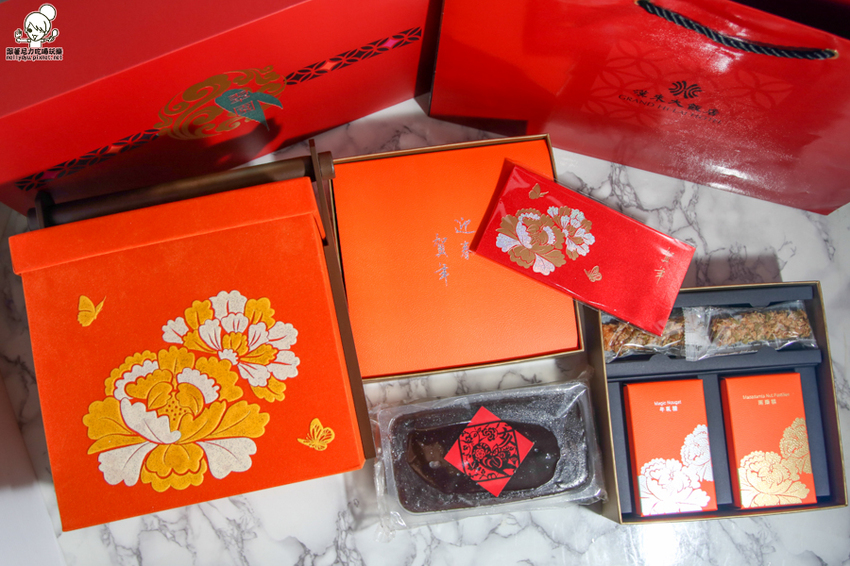 嬉春禮盒內含蜜汁核桃、脆皮腰果、南瓜子千層酥、黑糖桂圓年糕、國宴旺來酥、芝麻花生牛軋糖、南棗夏威夷果