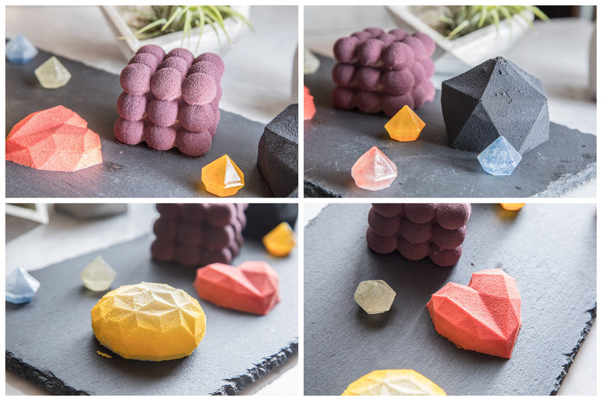 每一個幾何慕斯蛋糕都會附上兩個琥珀糖(口味隨機)琉璃,號稱可以吃的寶石,乍看之下很像一顆硬糖果,但入口時著實讓咬咬嚇了一大跳!這琥珀糖只有外層是一層硬脆的糖衣,裡面是軟芯寒天,薄脆及軟Q兩種衝突口感在口中相遇,碰撞出純粹清爽的甜蜜滋味
