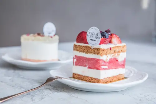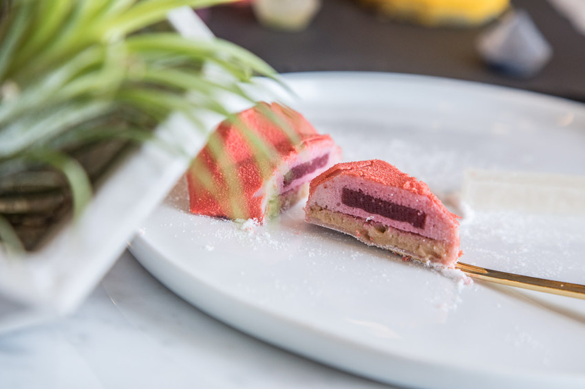 小胭脂是以草莓慕斯蛋糕為主體,入口即化在口裡散發出草莓甜香微酸的戀愛滋味,內餡堆疊三層,先夾入⼀層新鮮覆盆莓打成的果泥凍,再放入一層用甜菜根天然染色的海綿蛋糕,最後是甜脆英式餅乾底,柔軟細緻酸香,多層風味與草莓慕斯在口中融合,心也跟著融化了!