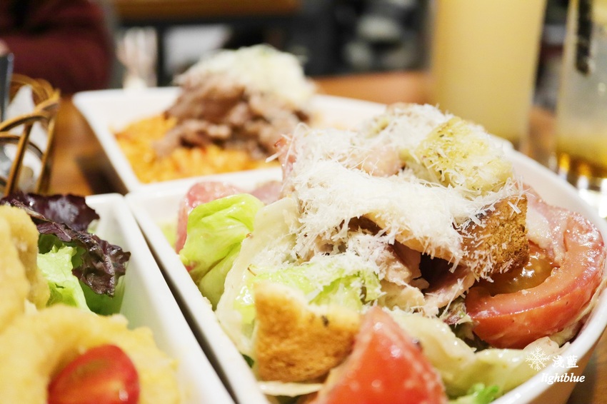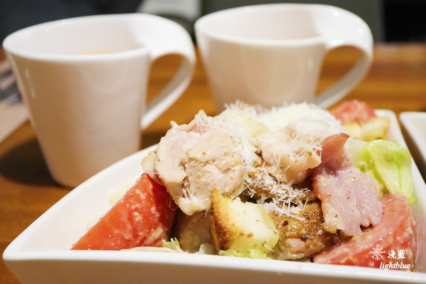 沙拉選了菜單上有作記號的推薦菜色「磚塊雞腿凱薩沙拉」,也是店裡的元老級沙拉