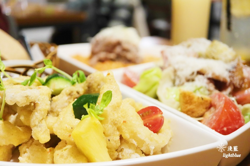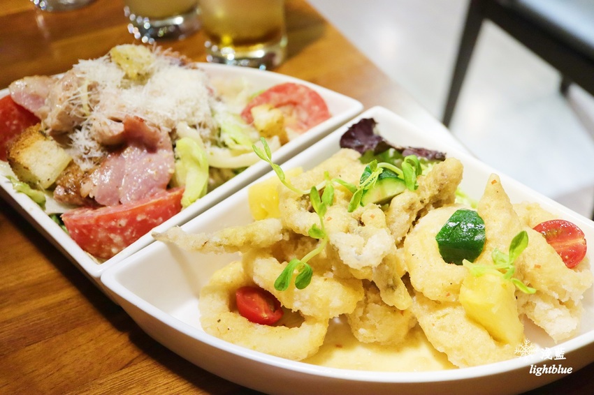 花枝質地Q彈,炸粉不會太厚,恰好增添酥脆口感,並能沾附醬汁。醬汁酸酸甜甜且有搭配少許生菜,都讓炸物更繽紛且解膩