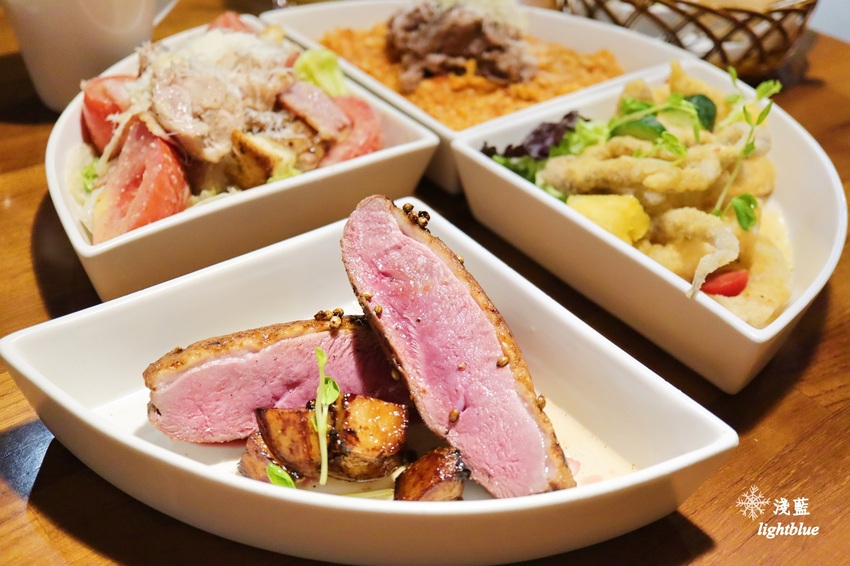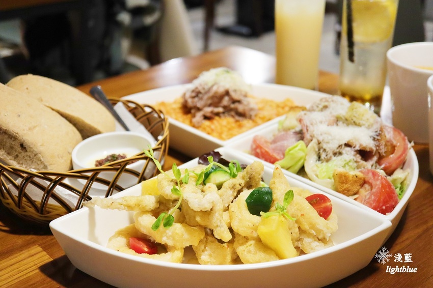 有單人的義大利麵、燉飯等餐點,也有雙人分享餐、四人分享餐,價格依所選主餐而不同。低消是飯/麵/沙拉,收35元清潔費。