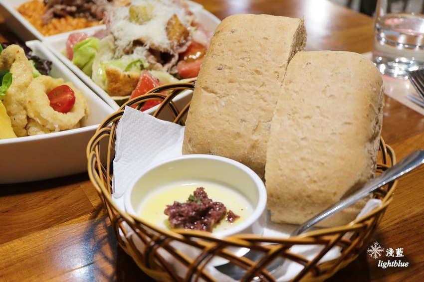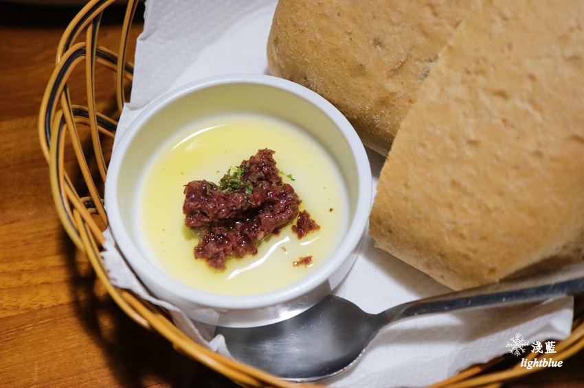 這天品嚐的是雙人分享餐,這是現烤麵包與手作橄欖醬,麵包柔軟而帶咬勁,份量不少但會讓人忍不住整塊吃完