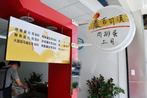 桌上藍色塑膠籃裡擺的是菜單,餐具自取