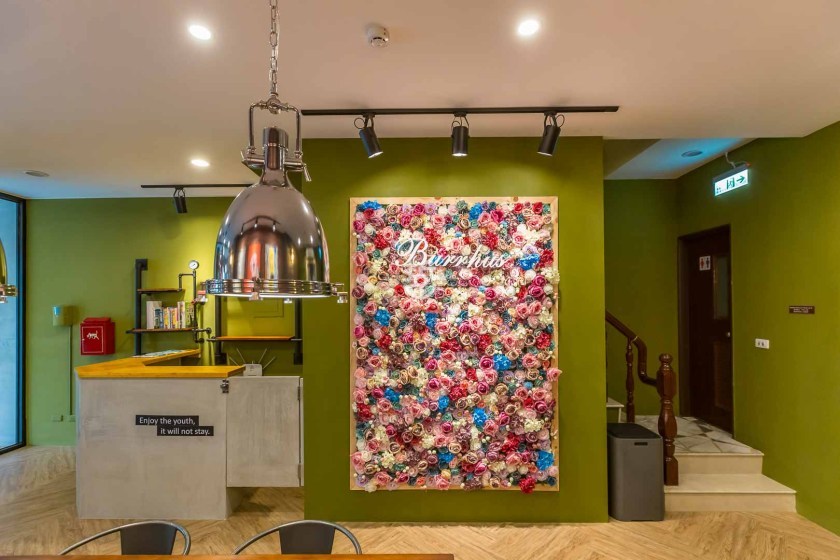 樓梯旁的另一面牆是抹茶綠色的花牆,讓入住的房客可在牆前拍照打卡PO IG。