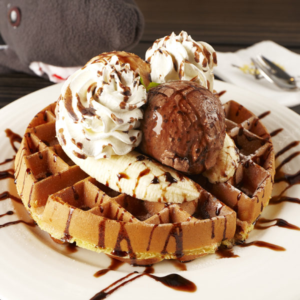 採用以純淨生乳製作的明治冰淇淋,巧克力的濃郁與香草的滑順口感,加上一整條份量的新鮮香蕉,沾抹著店家自製的鮮奶油,搭配香酥的鬆餅,女生可以與三五好友分食,一起享受超值美味的下午茶(上午12點之後供應。)