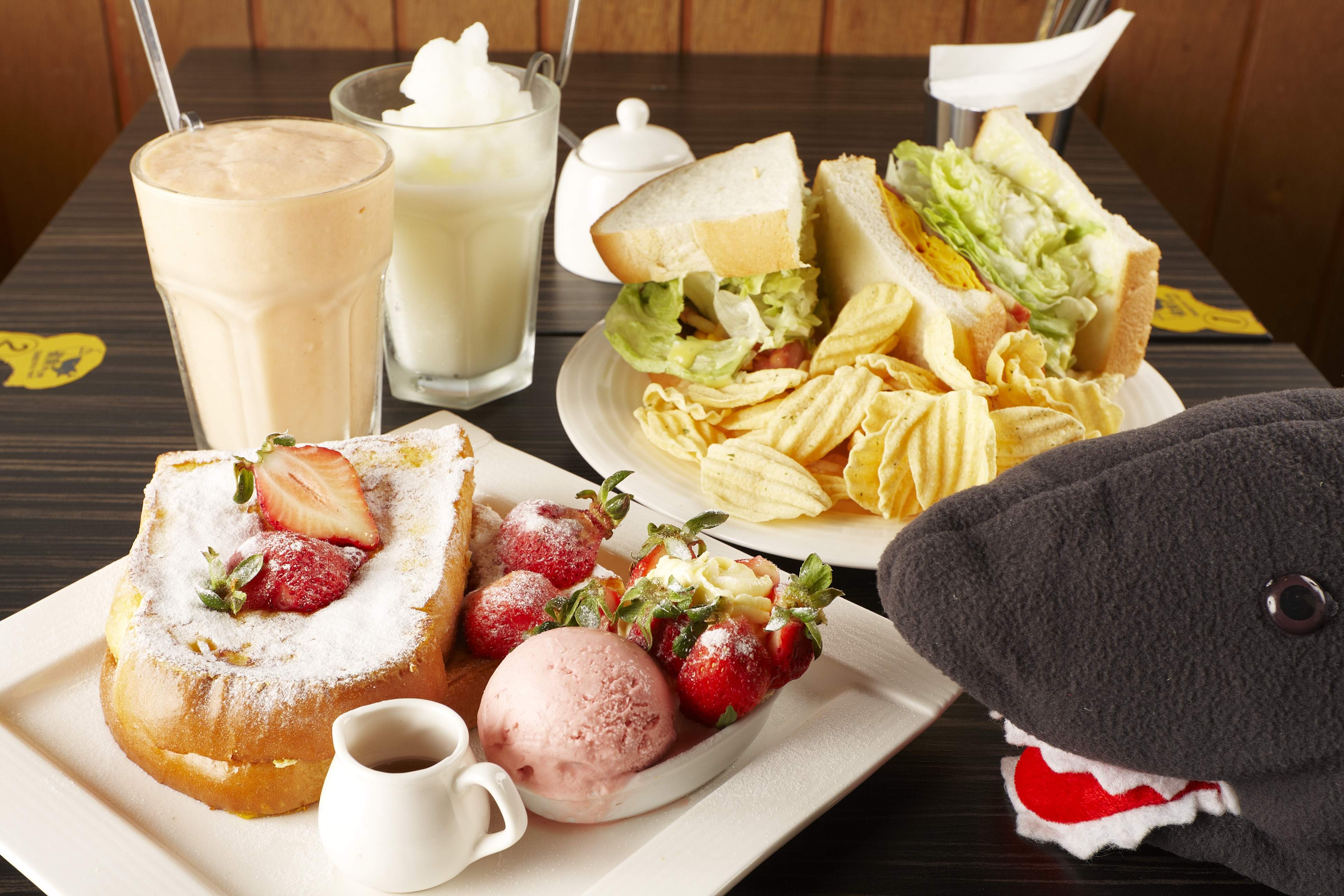 每日產地直送的新鮮大湖草莓,每顆都晶艷透紅,鬆軟的厚切土司,沾上特製蛋蜜香煎金黃,淋上楓糖與純白如雪花的糖霜,香濃的卡士達醬也可隨個人喜好搭配。