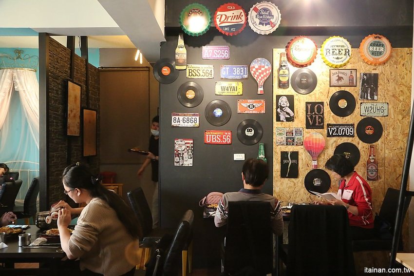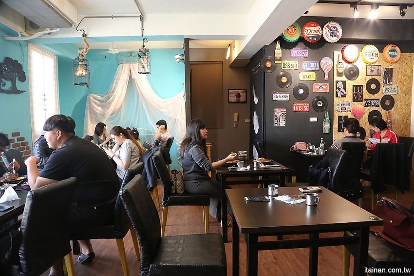 二樓的用餐環境一邊是走工業風的美式餐廳風格,另一邊以蒂芬妮綠的牆面布置出類似公主的房間一樣的浪漫夢幻。