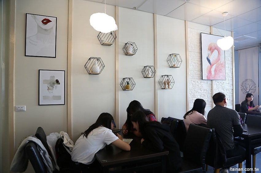 店裡的裝潢很特別,一樓以白色與輕柔的粉藍色,搭配雲朵造型的燈飾,整體帶點夢幻感。