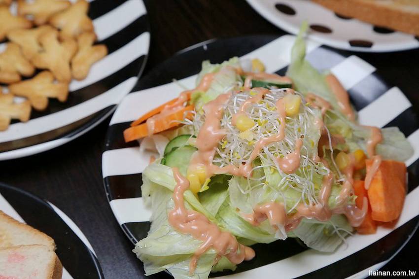 沙拉的部分有生菜、苜蓿芽、小黃瓜…等共5樣新鮮食材,直接搭配千島醬享用。