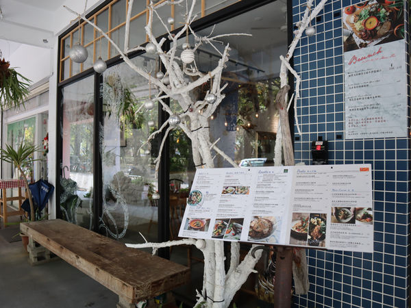 門口外頭有提供菜單,讓過路客能參考餐點跟價格,旁邊有著木製長椅提供休憩,