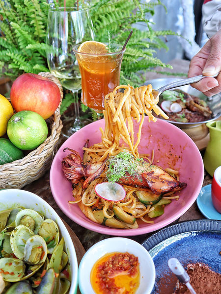 ▫️喜歡蝦醬的同學們這道必點!濃郁的蝦醬醬汁,是店家每日使用新鮮蝦子細細熬煮而成的精華,絕不馬虎,每一根麵條都緊緊巴住醬汁,每一口都是大寫的幸福,三姊特別喜歡這道。主菜是一整隻透抽,帶有炭烤香氣的新鮮Q彈,非常貼心的是已經把墨汁細心去除,再也不用擔心吃完變黑嘴了!林昆尼麵是細扁麵,相較於圓柱狀的Spaghetti更能吸附醬汁,嚼勁也不錯。⠀