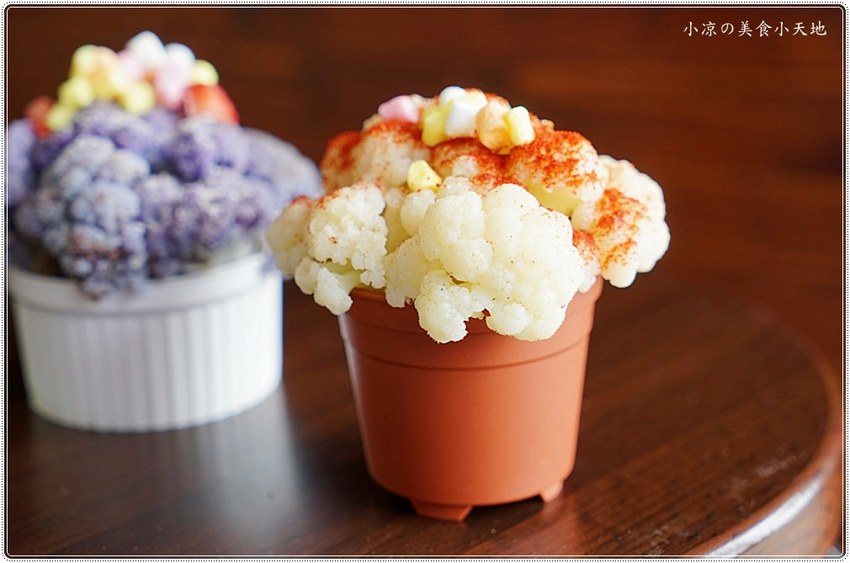 店家真的好有創意的將花椰菜川燙後放入盆栽內,在撒上七味粉、棉花糖等裝飾