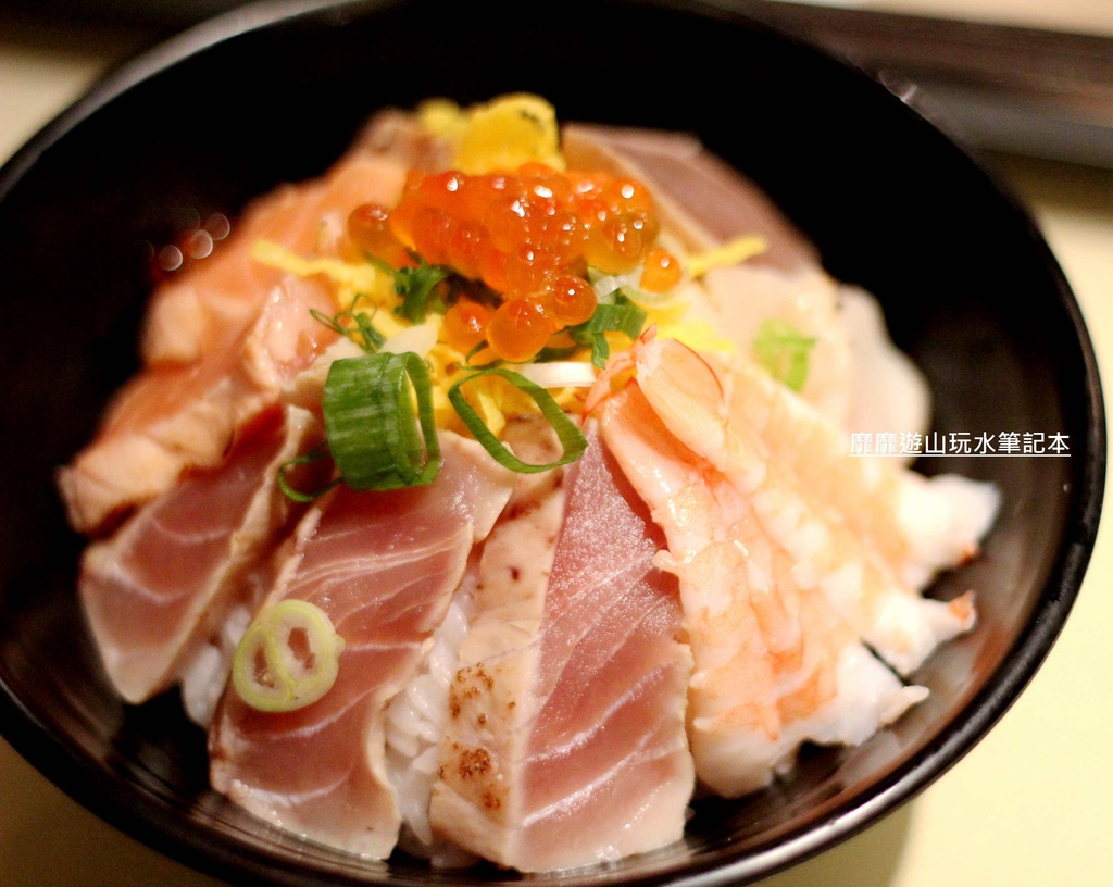 除了鮭魚、鮭魚卵之外還有蝦跟干貝,另外兩種疑似是鰹魚跟旗魚~