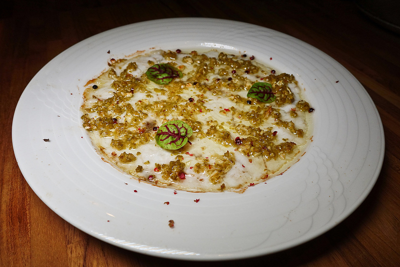 這道菜上來時一下很難連想到它是魚,用片成薄片的鱸魚配上綠橄欖鯷魚醬,再加上點大蒜風味,好吃又開胃。我甚至覺得它很適合下飯 ( 大笑) 可以配著味道稍重的魚片加上熱騰騰的白飯應該正好。