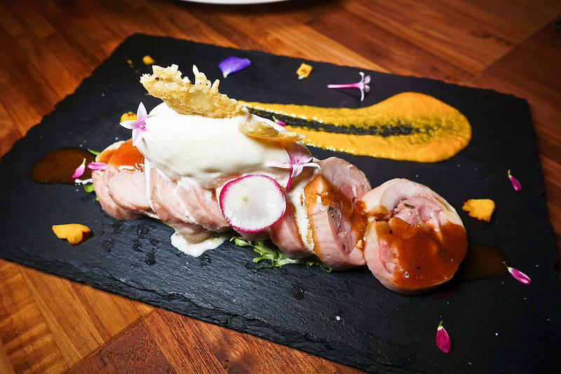 我蠻喜歡的一道菜,這道菜拍照要快,因為冰淇淋會融化(笑) ,搭配香料低溫慢烤的雞肉變得相當軟嫩,牙口不好的人也可以一口咬斷,配上醬汁以及冰淇淋融化後的甜味,相當好吃。如果再來也會必點的前菜