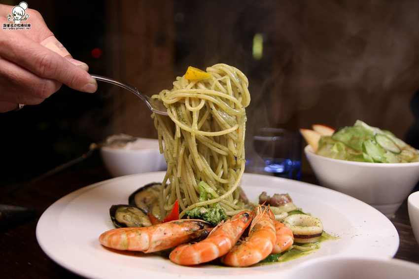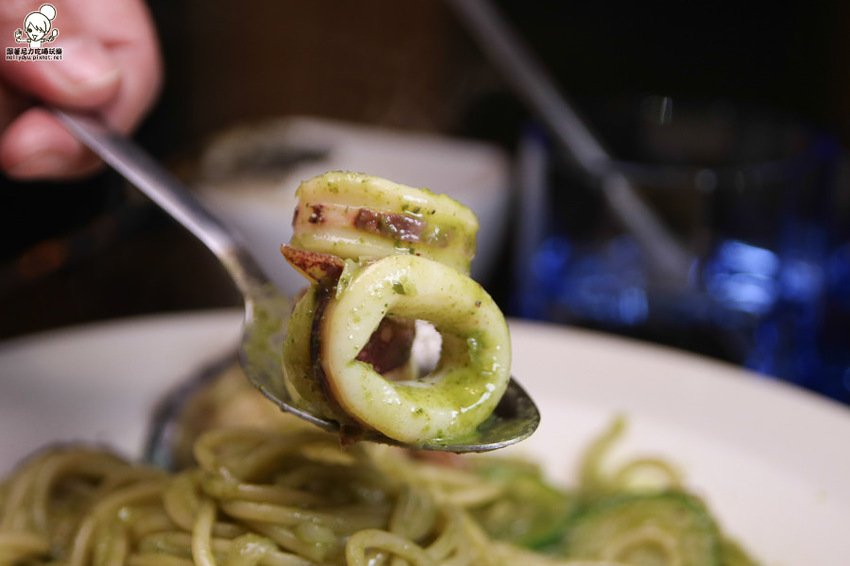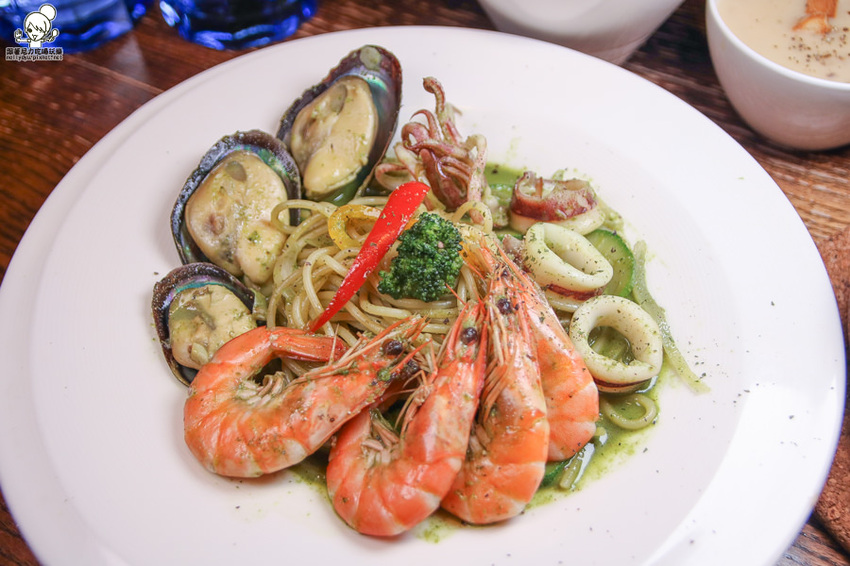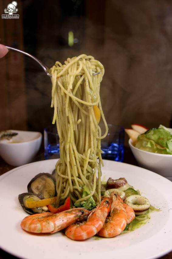 青醬本身調味很濃郁唷!每一口青醬義大利麵還保有海鮮甜味滲入