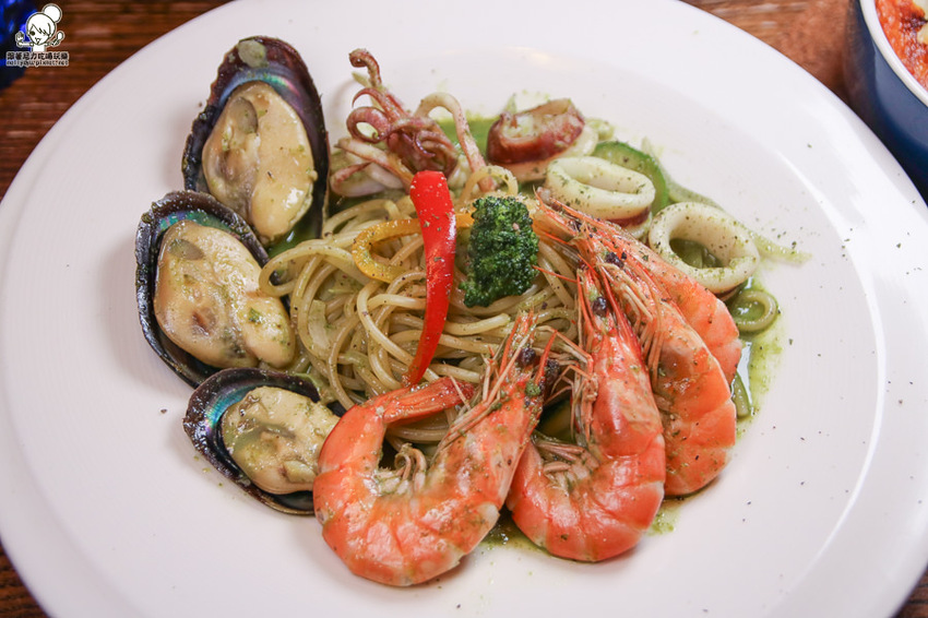 一整個就像大船入港的澎派海鮮義大利麵,一次可以吃到蝦子、淡菜、小卷等鮮味海鮮
