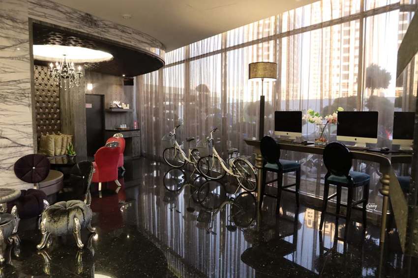 走進水雲端旗鑑概念旅館的一樓大廳,華麗的水晶燈上也排出旅館名,加上時尚的座椅,令旅客覺得感受到尊榮感。