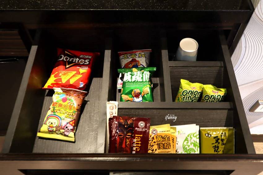 抽屜中有零食,有茶品及咖啡可以沖泡。