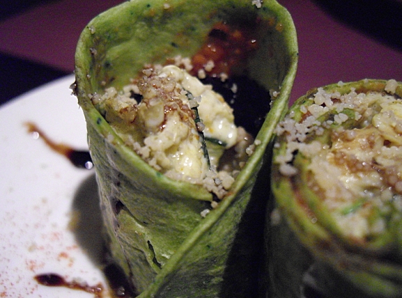 菠菜製成的墨西哥餅皮,鋪上包裹新鮮蔬菜的法式蛋捲,並以鹽燒海苔提昇香氣,這道特殊的開胃菜,包含了很多異國的風味,有法式蛋捲的香氣,還有日式海苔的風味,是一品很不錯的開胃菜。