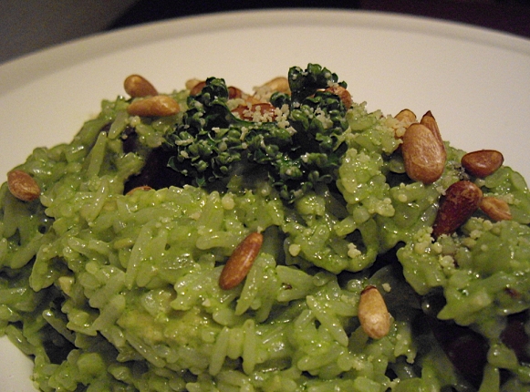 吸滿濃郁青醬、蔬菜香味的米飯,搭配香烤而成的松子,香氣十足的蘑菇,口感滑順,每一口燉飯都飽滿的吸足了青醬,松子的香與燉飯搭配的非常巧妙。
