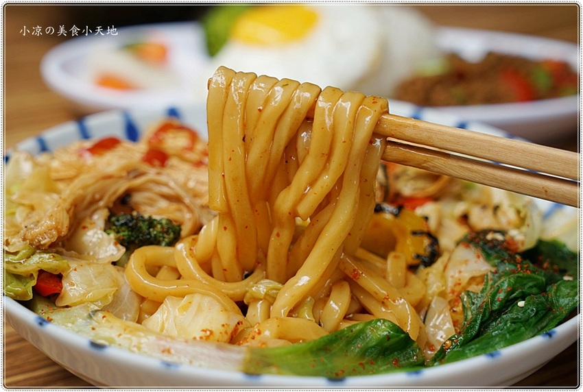 以讚岐烏龍麵去拌炒新鮮時蔬,並灑上七味粉增添香氣。