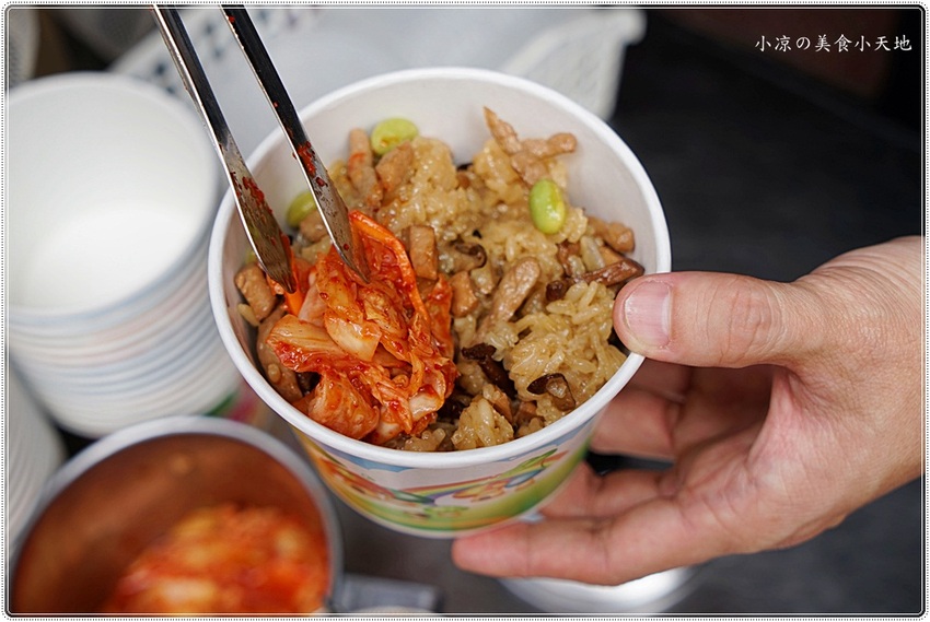 每一盒都會加入店家自製手工韓式泡菜,微酸微辣的清脆口感搭配油飯真的好對味