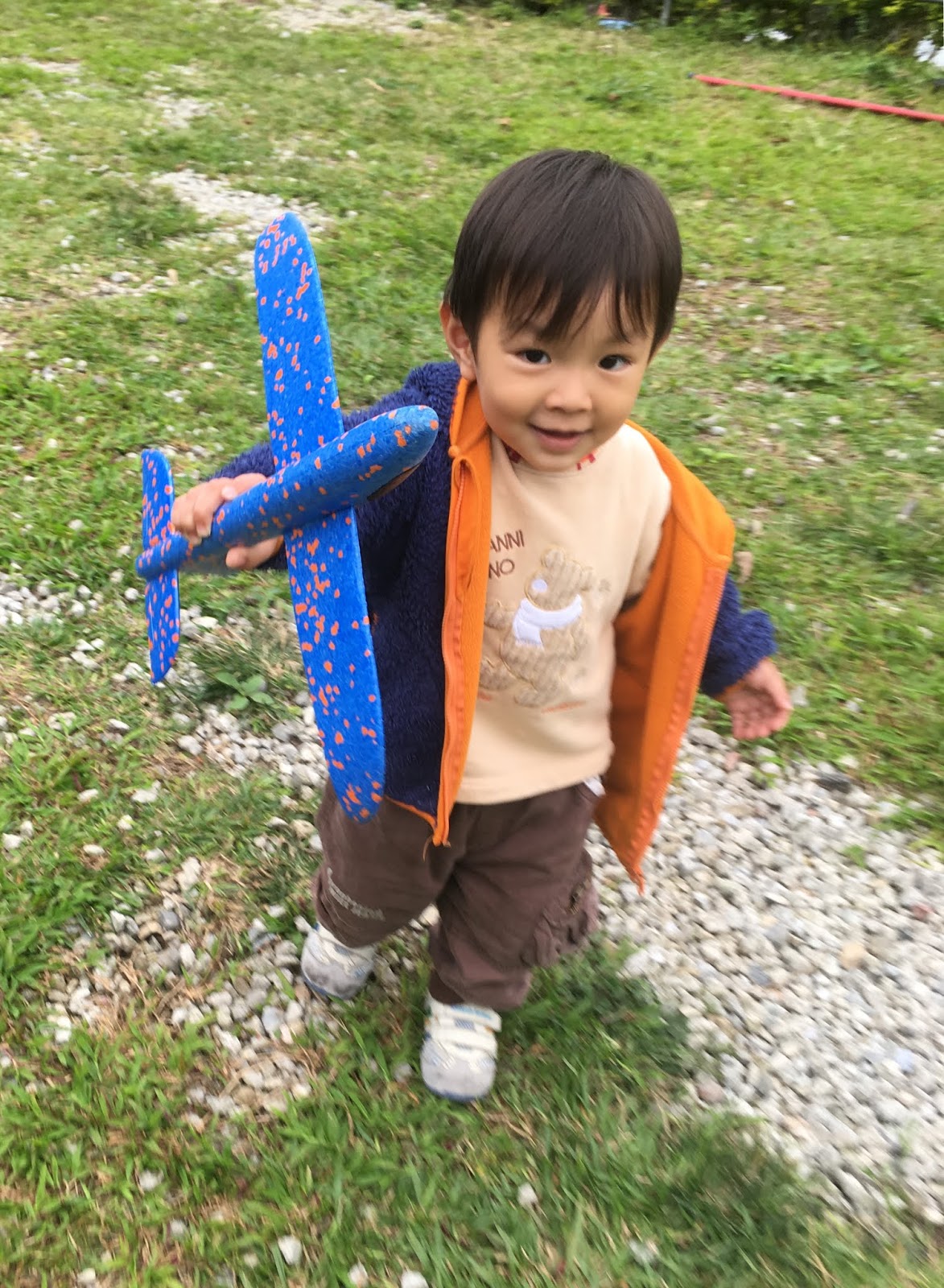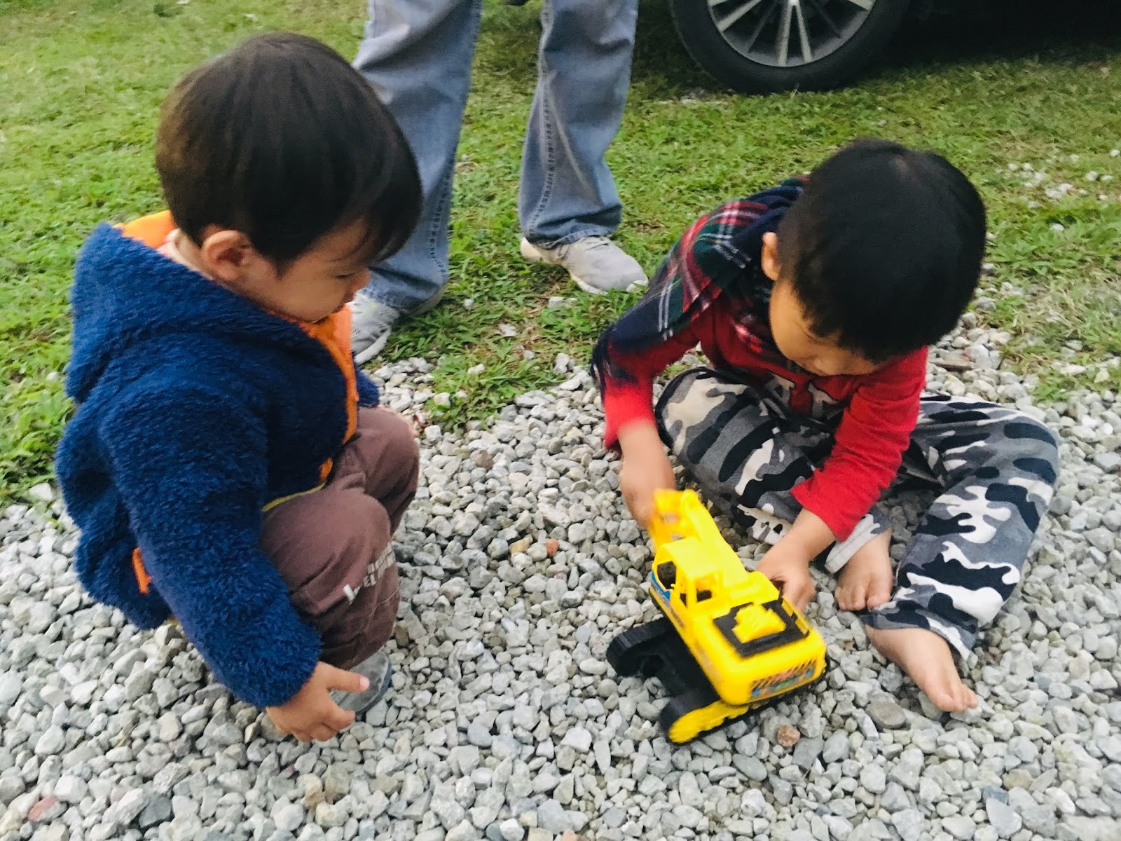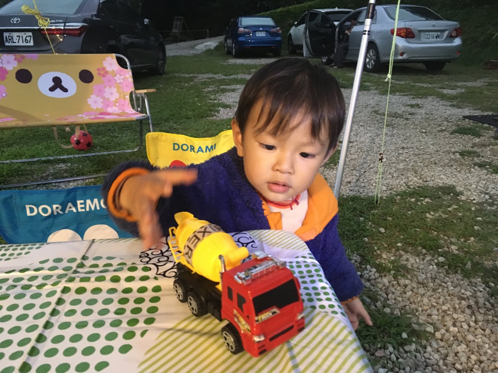 我原本已經做好親近自然就是要玩石頭、玩沙子的準備,結果媽媽們不約而同帶玩具來跟大家分享,小福寶在草地上推大球、手拋飛機、挖土機挖石頭、等恐龍蛋孵化...玩得不亦樂乎,而且大家一起包區,孩子跑來跑去都是在營區裡,爸爸、媽媽隨時看得到,很放心孩子的安全。