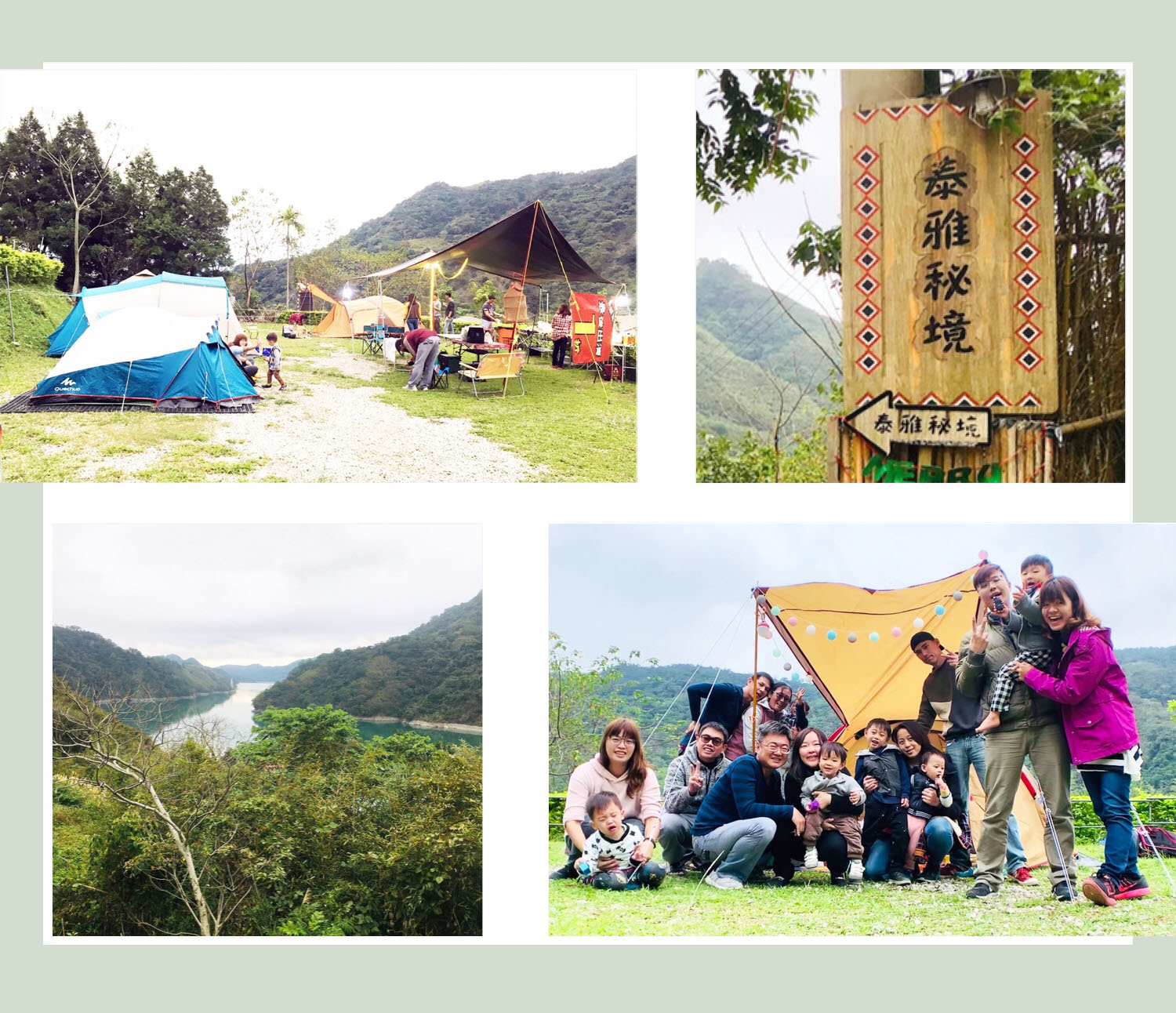 據老闆娘說,之所以命名「泰雅秘境露營區」,是因為老闆一家是泰雅族奎輝部落的大族簡家,營地為至今已傳承五代的祖傳土地,由老闆親手整理為梯式營位,因此在視覺設計和營地命名都採用泰雅族的風格,我們在抵達營地入口時,就已經感受到秀麗的湖光山色,想到今晚就要住在這裡,真是太享受了。
