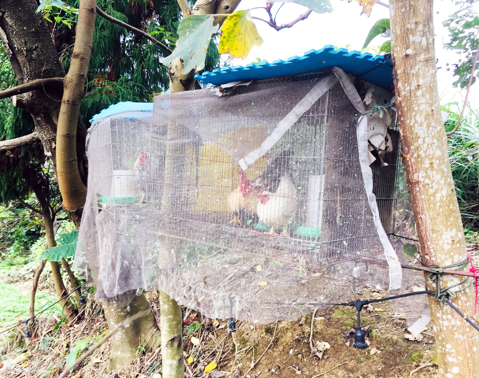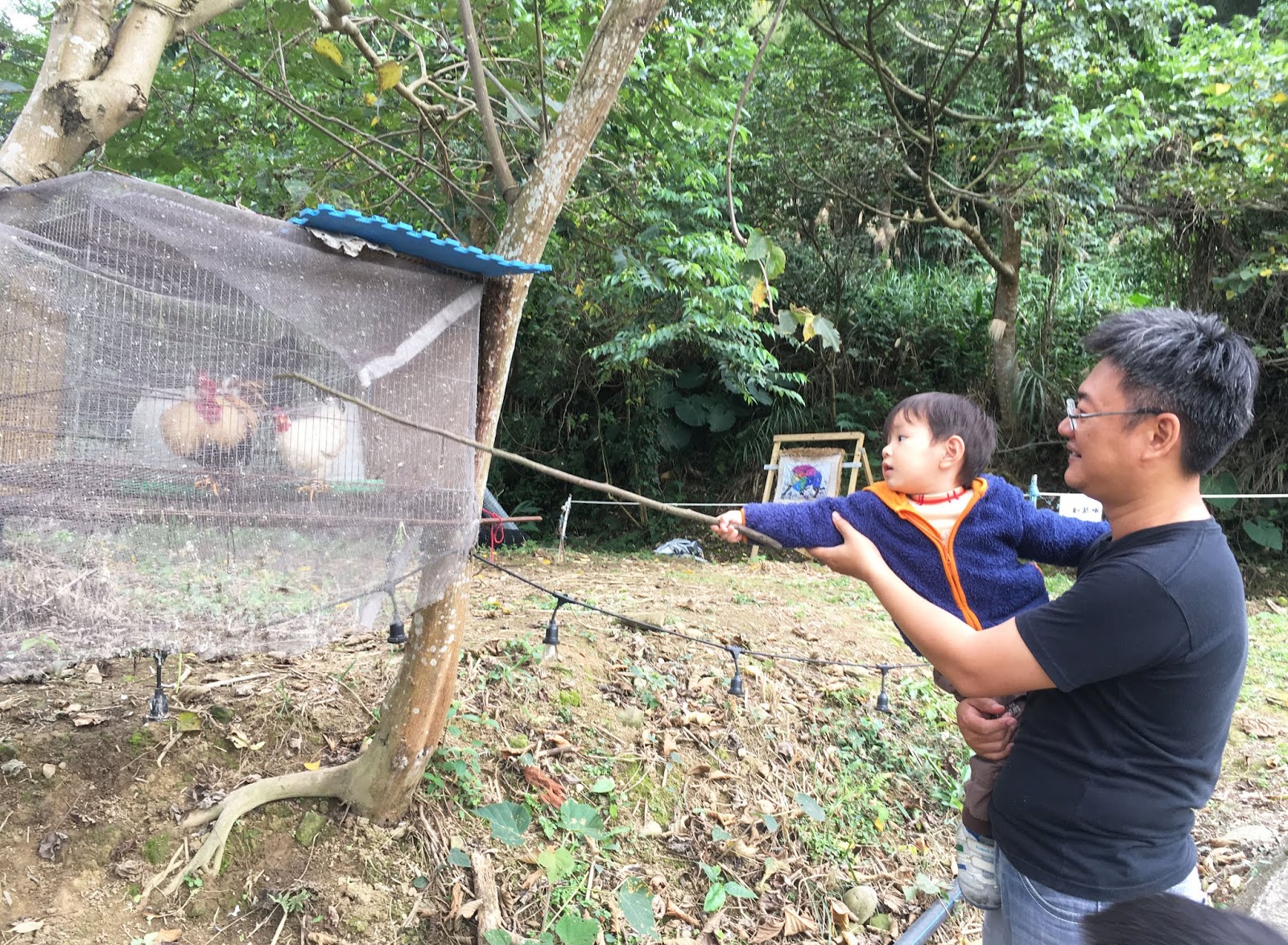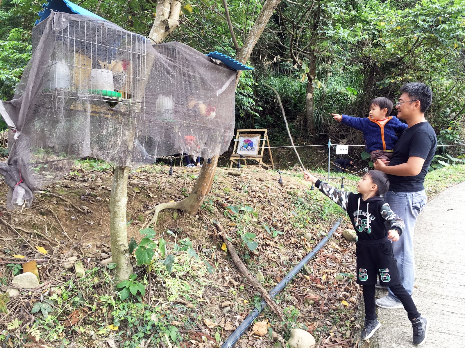 「射箭場」前的「雞舍」更吸引孩子們的注意,裡面有兩隻公雞和一隻母雞,小哥哥發現把樹枝湊過去,雞會跑過來,小福寶也跟著學。孩子們都很喜歡小動物,「雞舍」榮登小福寶來露營的一大亮點。